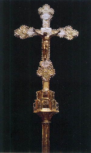 Cruz procesional procedente de la Iglesia parroquial de Torrelacárcel. Fue realizada a mediados del siglo XV en talleres catalanes o levantinos. Fabricada en plata dorada claveteada sobre alma de madera. Sus dimensiones son 100 x 41 cm.