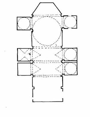 Obra barroca del siglo XVII, de cantería y mampostería con planta de cruz latina. Flanqueando esta nave se abren diversas capillas cubiertas generalmente por cupulillas que al exterior se acusan como una nave de menor altura que envuelve a la principal. Tiene, por otra parte, un pórtico a los pies de dos tramos.