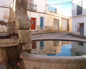 El agua se canaliza hasta la fuente de la plaza. Fuente construida en piedra, con frente flanqueado por dos volutas. Los caños dan a una pila rectangular, la cual desagua en una balsa circular también de piedra. Presenta una inscripción de 1958. El caño de la fuente recibe el agua de la "fuente de allá" y de otro manantial del Pedregal. El agua sobrante de la fuente va a parar al lavadero.