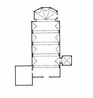 Templo parroquial de Bádenas reconstruido tras la Guerra Civil, dedicado a Santiago. Lo actualmente visible es la superposición de dos iglesias. La primitiva era un templo con una nave de cuatro tramos construido en manposteria con cabecera poligonal y bóvedas de cruceria que se destruyo en la Guerra Civil y en cuyo interior se reconstruyó otra iglesia en 1958, aprovechando el campanario y conservando los muros perimetrales de la primitiva, que se habían conservado hasta cierta altura. En estos muros se aprecian los arranques de las bóvedas en varios puntos de la antigua cabecera y de la nave.