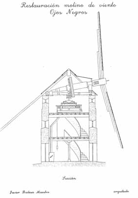 Molino de viento, de torre mediterránea, cubierta con forma cónica y bastante peraltada, siendo toda ella de madera. Esta ubicado en Ojos Negros. Por su tipología se le puede datar entre los siglos XVI y XVII. Posee dos plantas, la primera recibe el nombre de camareta, se trata de una habitación de tránsito en la que se guardaban diversos útiles como los lienzos, las aspas, las sogas, las cuñas etc. la alacena excavada en el muro servía para este fin. La escalera que asciende de la planta primera estaba situada en la proyección de la de la planta baja. La planta segunda o moledero es la más importante, puesto que albergaba la maquinaria de molienda. Presenta tres ventanas, con la finalidad de averiguar la dirección del viento y orientar las aspas, moviendo la totalidad de la cubierta. La maquinaria está formada por las aspas, en número de dos, el eje que se encuentra apoyado en las piedras bóllega y rebote, la rueda catalina, rueda dentada, unida firmemente al eje y que rueda con éste, la linterna atravesada por el barrón y, por último, la piedra que gira denominada volandera y, debajo de esta piedra, la solera que es fija y se apoya en una bancada de obra.