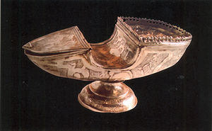 Naveta fabricada a finales del siglo XVI en plata fundida y repujada, procedente de la Iglesia parroquial de Torrelacárcel. Mide 7x16 cm.