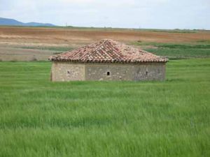 Noria de Mainar con el pozo en el centro de una edificación poligonal cubierta por techumbre cónica. El edificio está realizado en mampostería.