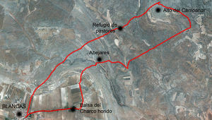 El camino parte desde la localidad de Blancas, siguiendo un tramo asfaltado durante 500 m. hasta llegar a una zona de pajares. Pasa entre ellos para enlazar con la antigua senda a Villalba de los Morales. Hay que seguir esta senda, ascendiendo ligeramente a lo largo de todo el trayecto, hasta llegar a la zona del Alto del Campanar, una pequeña colina que actúa de mirador de todo el término municipal. Atravesaremos en el camino algunos refugios de pastores. Bordeando este monte por la parte más baja, el sendero se aleja del camino para adentrarse en una zona más abrupta. Tras llegar a una antigua masada, se recuperan los caminos vecinas y se inicia el camino de regreso.