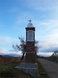 El tronco y el edículo, que forman un solo cuerpo, comparten un vano rectangular de buen tamaño que enmarca las cerámicas con la imagen de los santos y su leyenda "Actas de los mártires Abdón y Senén, nobles virreyes y guerreros persas, sufieron martirio en Roma, durante la persecución del emperador Decio, hacia el año 253 d.C. popularmente son patronos del pan y del vino". Ambos cuerpos -tronco y edículoson lo único que queda de la primitiva obra de ladrillo, en cuanto a su culminación, podemos ver un cimacio sobre cornisa moldurada de ladrillo que sirve de apeo a un tronco de cono sobre el que se mantiene la nueva cruz de hierro. Es más clásico que el resto.