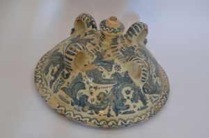 Tape de pila bautismal de la iglesia de Nombrevilla, en forma de cúpula, con cuatro asas, decorada con hojas de color azul sobre fondo blanco. Cerámica de Villafeliche. Siglo XVIII