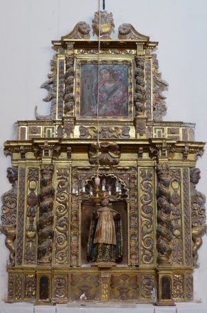 Este retablo de la iglesia de Torralba de los Frailes es de fines del siglo XVII, con el titular en la hornacina central y Santa Bárbara en el remate.