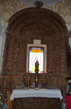 Este retablo de la iglesia de Villafeliche está sin policromar. Tiene las imágenes de las Santas Justa y Rufina, y entre ambas, la Virgen del Pilar.