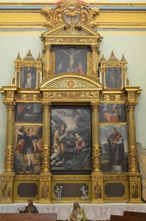 Este retablo de la iglesia de Villarroya del Campo mide 3,54 m. de ancho. Está compuesto por una mazonería clasicista, dorada, formada por columnas corintias que dividen tres calles con un banco, cuerpo y remate con tres historias; esta mazonería encierra lienzos pintados al óleo, pudiéndose fechar todo en torno al año 1600. El lienzo central representa la Anunciación (160 x 106 cm.), con San Miguel y San Antonio Abad a los lados (132 x 77 cm.); sobre ellos, Santo Tomás de Aquino y San Juan Crisóstomo sentados ante la mesa de trabajo. El lienzo central lleva la siguiente inscripción en el ángulo inferior derecho: Pº EL MUDO ME FECIT 1636.