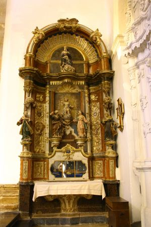 Ubicado en la Iglesia parroquial de Calamocha. El retablo de la Sagrada Familia, algo posterior al baldaquino, reproduce un esquema muy similar al de San Antonio Abad y San Francisco de Paula (1755) y al de la Inmaculada (1784); en ellos se aprecia cómo evoluciona el barroco a lo largo del XVIII: planta cóncava, desaparición de las columnas en los extremos, siendo sustituidas por imágenes, etcétera. Todos ellos realizados por el taller de Francisco Navarro.