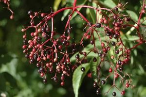 Esta planta produce unos frutos negros casi esféricos de unos 4 mm. de diámetro unidos en una especie de racimo. Cuando están inmaduros son verdes, pero al desarrollarse a lo largo de agosto toman un color rojizo y después negro. A las currucas y a otras aves del bosque les encanta comer estos frutos. Estos arbustos son muy importantes para la conservación de las aves migratorias. En ocasiones, los trabajos de limpieza de los ríos eliminan las sauqueras lo que reduce posibilidades de sobrevivir a las pequeñas currucas.