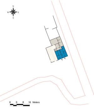 La zona de vivienda, formada por dos casas independientes de dos plantas con tejado a dos aguas, se localiza en el ángulo SE del complejo, con acceso desde el lado S, del exterior del mismo.