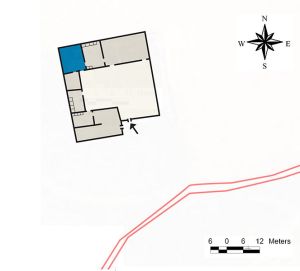 La vivienda se encuentra en el ángulo NE del conjunto, presenta dos plantas comunicadas por una escalera ubicada en la pared N. En la planta baja presenta cuatro estancias cuadrangulares separadas por tabiques de adobe revestidos con yeso: un patio en el que se localiza una puerta para acceder a una cuadra, las puertas de acceso a las otras tres estancias y las escaleras de acceso a la segunda planta, así como una estructura junto a las escaleras que pudo ser un banco o basar; una cocina con hogar y trasfuego rectangular, así como una despensa o reposte (lugar de almacenamiento) con estantes en la pared; dos cuartos, uno al lado NE y otro al NO con ventanas de reducido tamaño y con reja (dormitorios) pintados en azul.