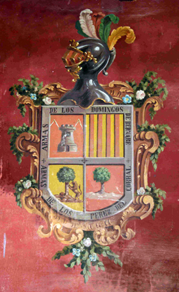 Cuartelado en cruz: 1º una torre superada por dos elementos que parecen dos llaves, del escudo de Bernabé; 2º cinco gules de las armas reales aragonesas; 3º un árbol con un león empinado; 4º un árbol. Rodeado por una leyenda "Armas de los Domigos de Bernabé" y "Armas de Pérez del Coral". Timbrado por un yelmo. Las familia Domingo de Bernabé aparece empadronada en San Martín en 1787. Su enlace con los Pérez del Corral puede ser posterior a esta fecha, al igual que el escudo.