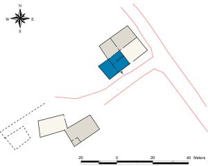 El núcleo de construcciones situado más al E, está formado por la vivienda, en en la esquina SO, un corral y dos parideras. La vivienda tiene tres plantas, con una gran puerta de acceso de doble hoja en el lado S. En la planta baja se localiza el patio con las escaleras de acceso a la segunda planta en el lado e y otras escaleras de acceso al edificio contiguo donde se ubica el palomar; una cocina con chimenea y horno de pan cocer con cúpula semiesférica de adobe 81,70 m de diámetro y 1,20 m de alzado interior); una cuadra con pesebres y una estancia de almacenaje bajo el hueco de las escaleras. En el patio se localizan numerosos grafitos incisos de rosetas o hexapétalas, dos cuchillos, otros símbolos geométricos y un busto de hombre con gorra (a carboncillo).